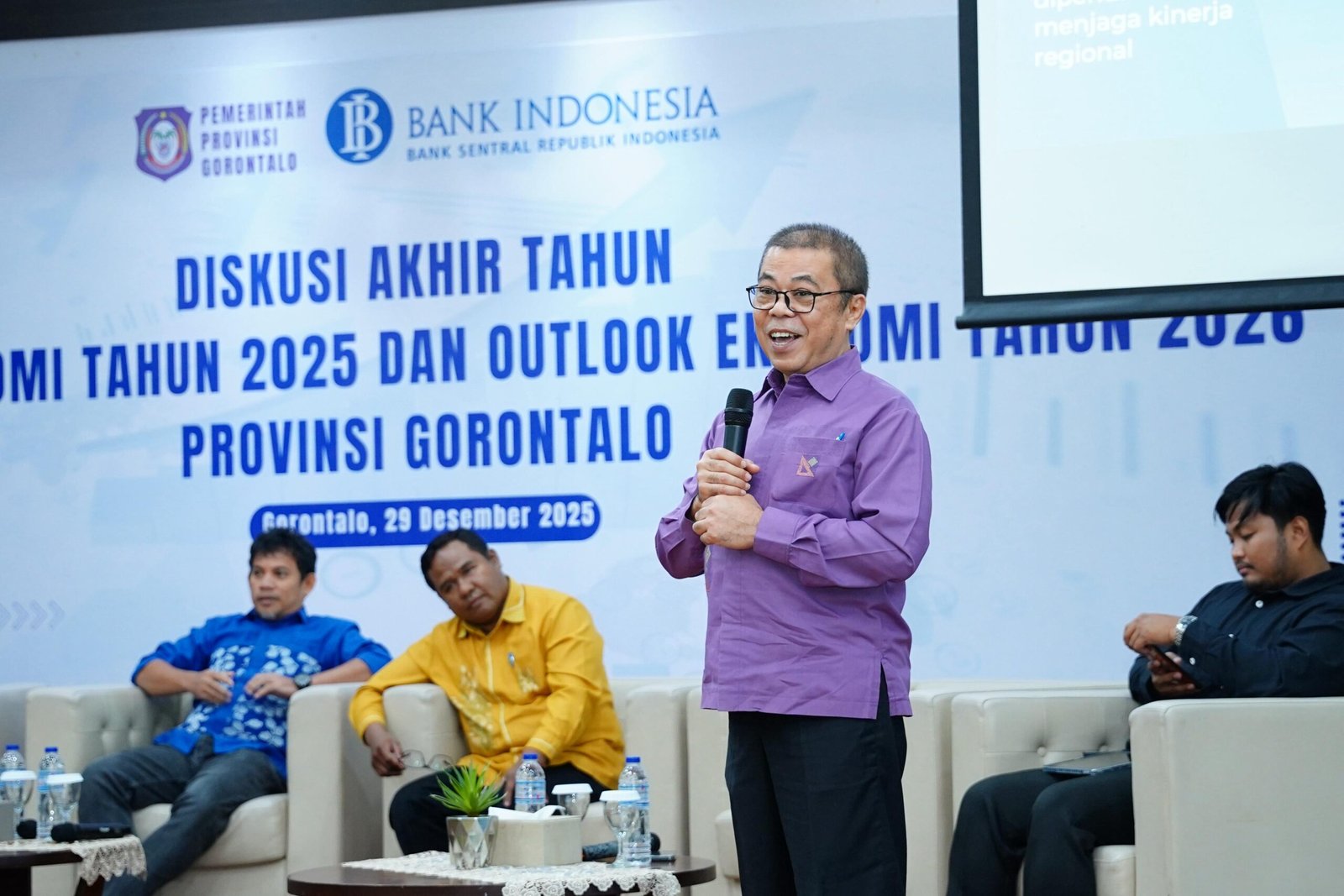 Profesor Syarwani Canon menyampaikan pandangan dalam Diskusi Akhir Tahun bertema Refleksi Ekonomi 2025 dan Outlook Ekonomi 2026 yang diselenggarakan oleh Pemerintah Provinsi Gorontalo bersama Bank Indonesia, Selasa (29/12/2025). (Foto: Istimewa).