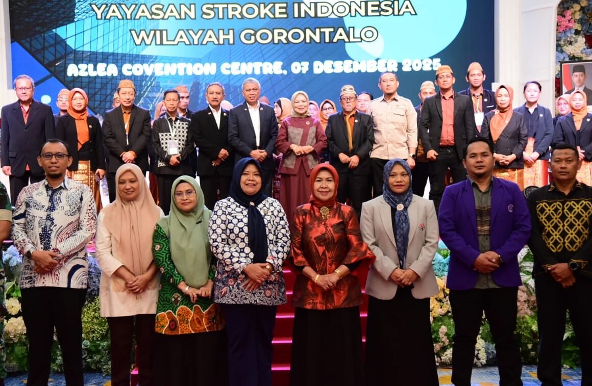 Wakil Gubernur Gorontalo Idah Syahidah Rusli Habibie bersama Ketua Umum PP Yastroki Mayjen TNI AD (Purn) Dr. dr. Tugas Ratmono dan jajaran Pengurus Yayasan Stroke Indonesia (Yastroki) Provinsi Gorontalo periode 2025–2030 di Ball Room Azalea Convention Center, Minggu (7/12/2025). (Foto: Redaksi).
