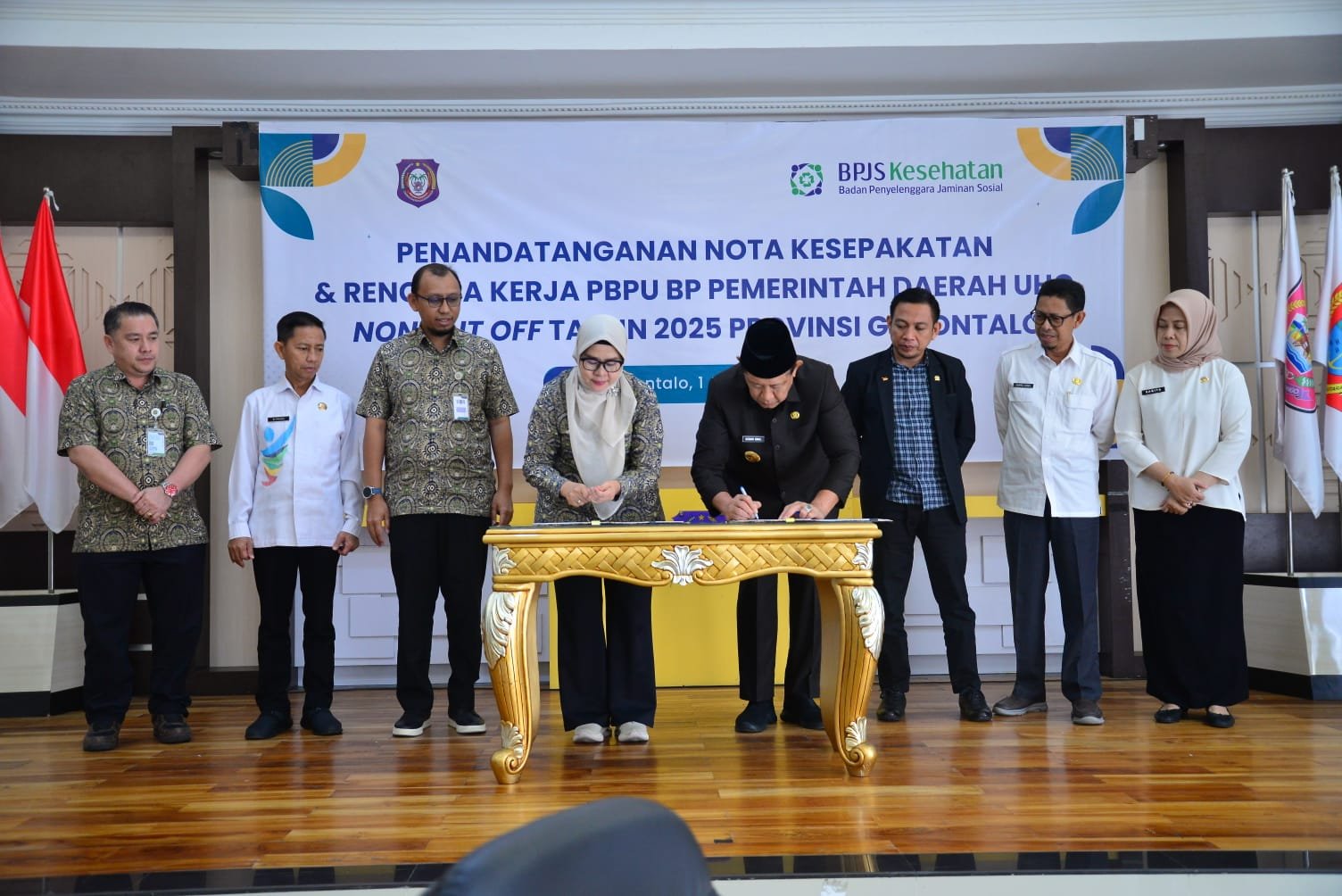Dalam kesempatan yang sama, Pemerintah Provinsi Gorontalo dan BPJS Kesehatan menandatangani nota kesepakatan dan rencana kerja PBPU BP tahun 2025. Kesepakatan ini menegaskan komitmen Pemprov untuk memperluas cakupan jaminan kesehatan dan memastikan seluruh warga memperoleh akses layanan yang layak.
